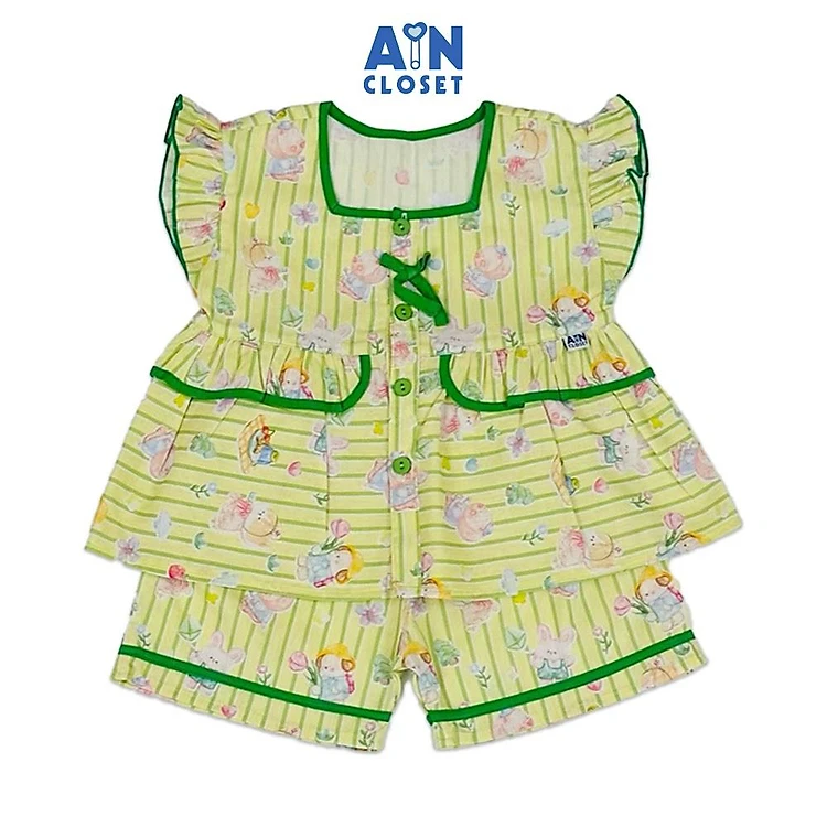Bộ quần áo Ngắn bé gái hoạ tiết Gấu Kẻ Xanh Cotton - AICDBGPO7MYO - AIN Closet