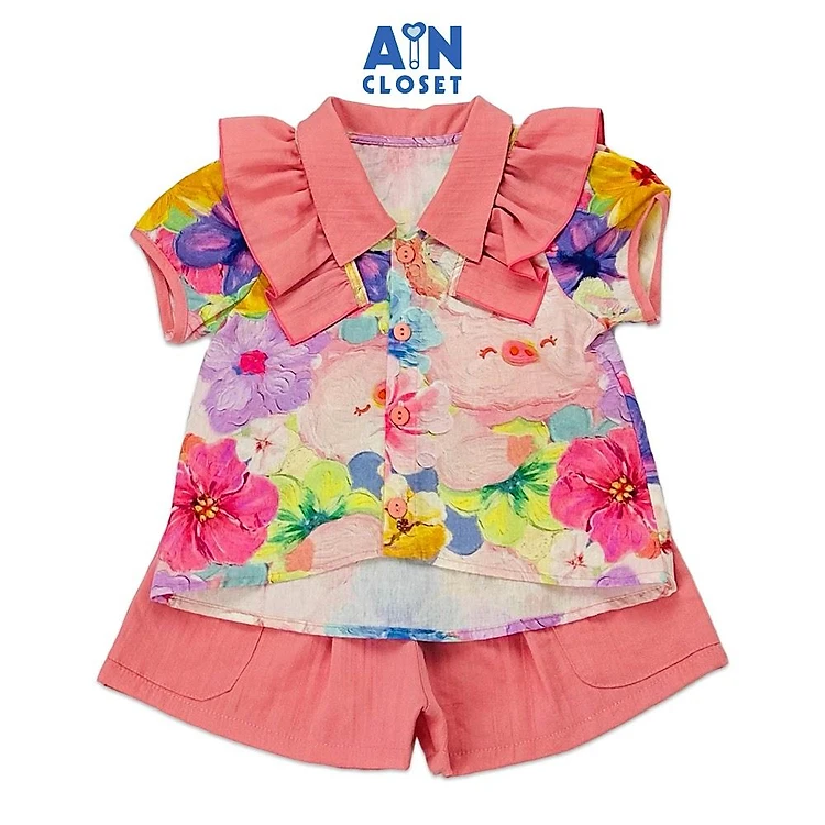 Bộ quần áo ngắn bé gái họa tiết hoa Dâng Bụt hồng cotton - AICDBGBJZ3IS - AIN Closet