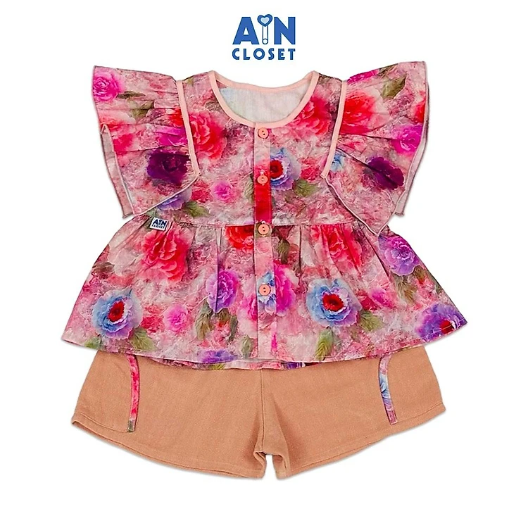 Bộ quần áo Ngắn bé gái hoạ tiết Hoa Hồng Tím Cotton - AICDBGJFBQ7S - AIN Closet