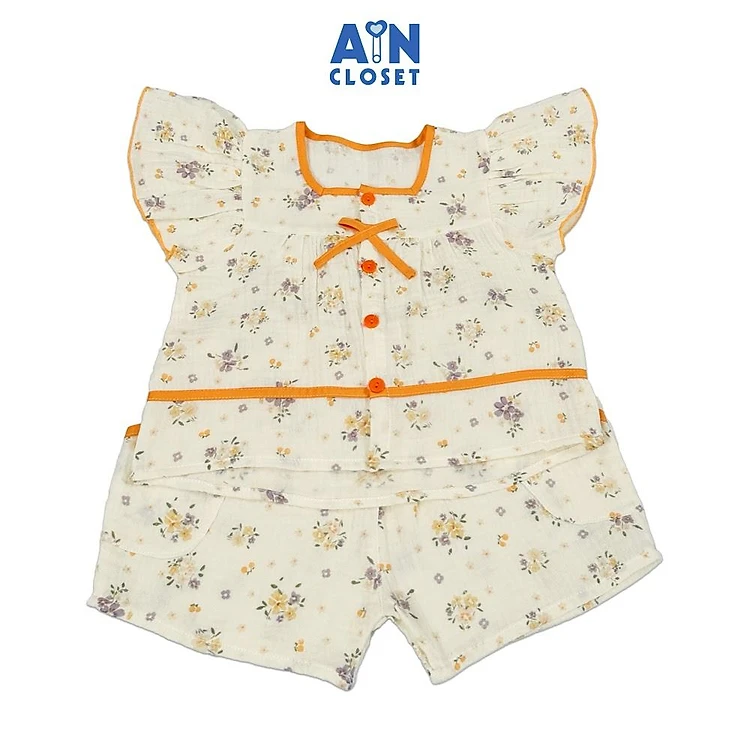 Bộ quần áo Ngắn bé gái họa tiết Hoa Nhí Vàng Tím viền Cam Xô muslin - AICDBGXKDIY6 - AIN Closet