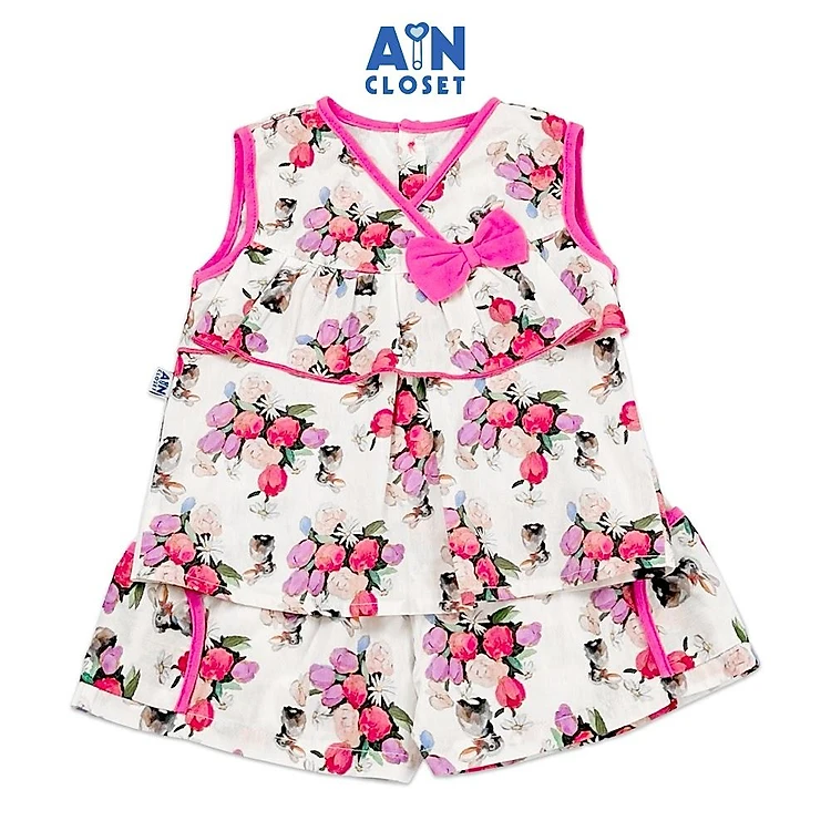 Bộ quần áo ngắn bé gái họa tiết Tulip Nơ hồng tím cotton - AICDBG0IXWDH - AIN Closet