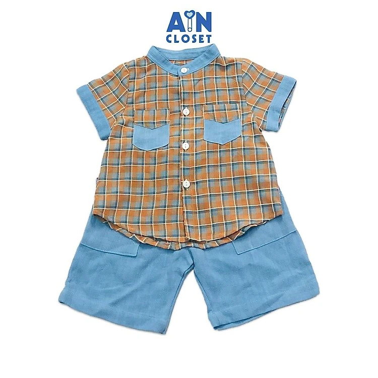 Bộ quần áo ngắn bé trai họa tiết Sơ mi caro xanh cotton - AICDBTD5HE7V - AIN Closet
