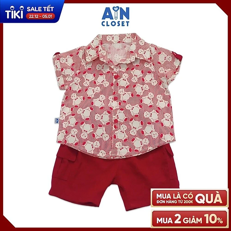 Bộ quần áo ngắn bé trai họa tiết Sơ mi Gấu kẻ đỏ cotton - AICDBTN5MU0U - AIN Closet
