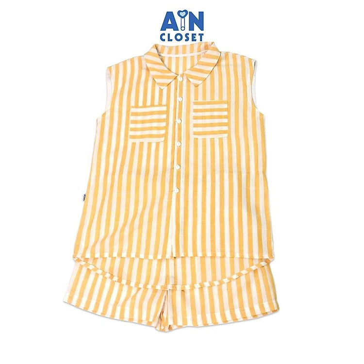 Bộ quần áo ngắn cho mẹ họa tiết Kẻ vàng trắng cổ sơ mi linen cotton - AICDMEXU7K6V - AIN Closet