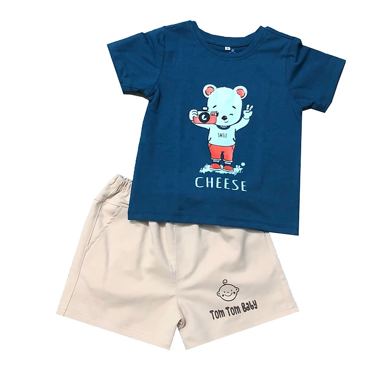 Bộ quần áo trẻ em cotton cộc tay TomTom Baby cho bé trai size 1 đến 5 Tuổi - Áo Xanh Đậm, Quần Kem