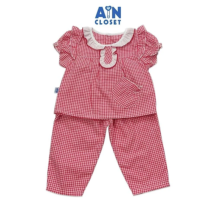 Bộ quần dài áo tay ngắn bé gái họa tiết Caro đỏ bèo cotton - AICDBGZADZBR - AIN Closet