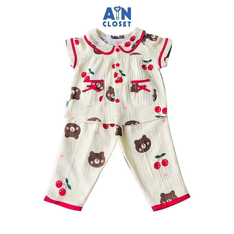 Bộ quần dài áo tay ngắn bé gái họa tiết Cherry Gấu xô muslin - AICDBG6GEAYS - AIN Closet