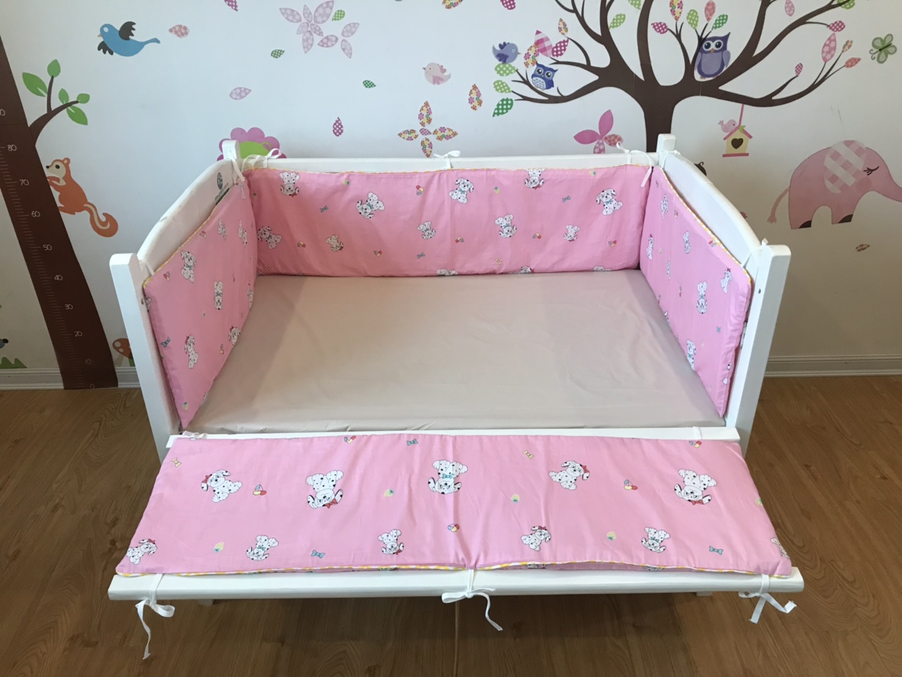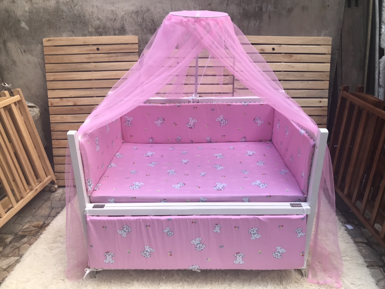 Chiếc cũi cho bé sẽ trở nên hấp dẫn đáng yêu hơn với bộ phụ kiện quây cũi mẫu chó hồng cho bé này.