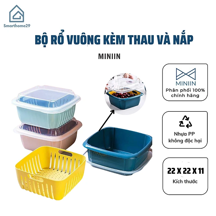 Bộ Rổ Vuông Kèm Thau Và Nắp Đậy Tiện Dụng - Hàng Loại 1- Giao Màu Ngẫu Nhiên