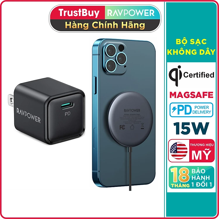 Bộ Sạc Không Dây Mag.Safe Nam Châm Hít 15W RAVPower RP-WC012-WC-B Kèm Củ Sạc Type-C 20W Dành Cho iPhone 14, Cho iPhone 13, iPhone 12 - Hàng Chính Hãng
