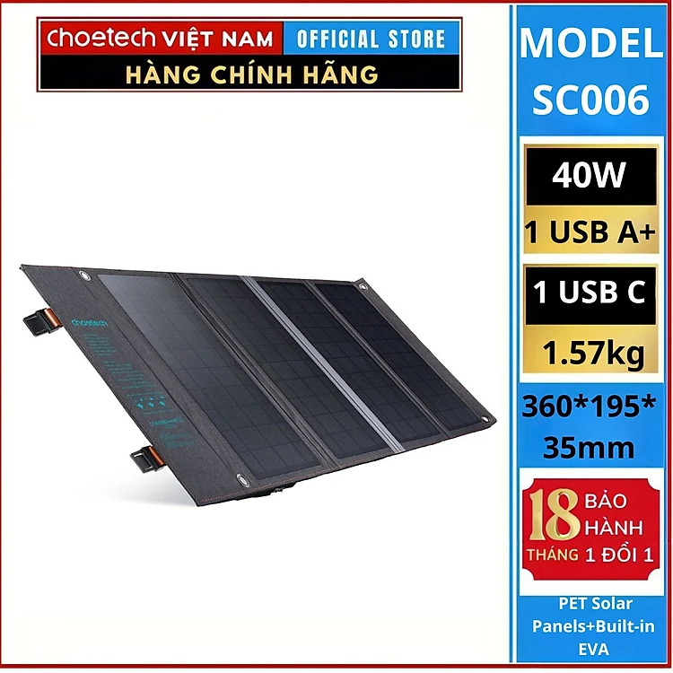 Bộ sạc năng lượng Choetech SC006 di động 40W có thể gấp gọn (Hàng chính hãng)