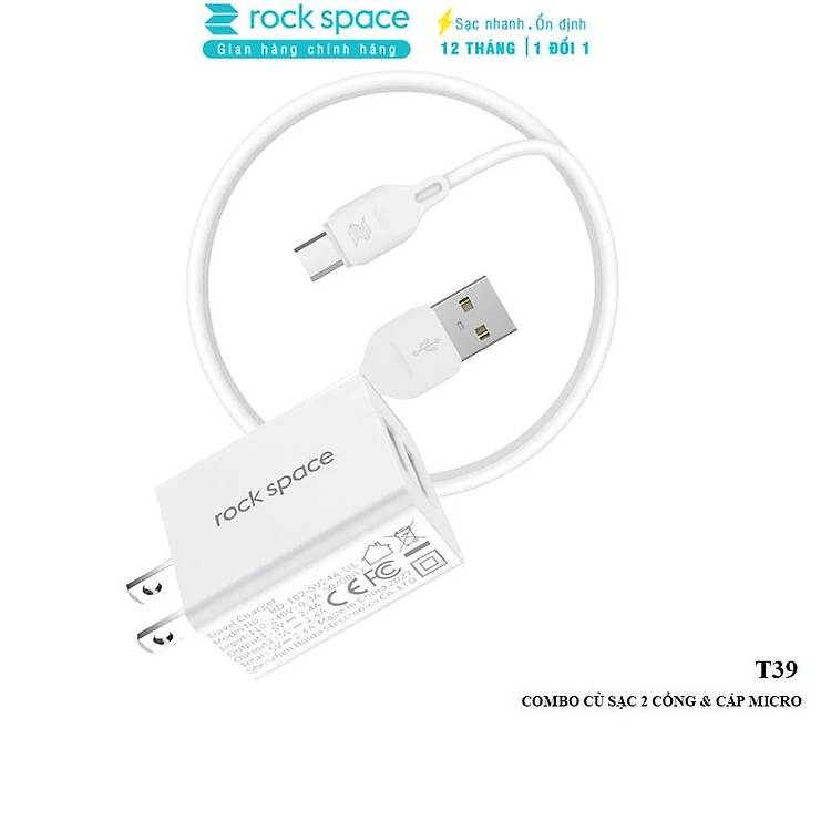 Bộ sạc nhanh Micro Rockspace T39 2 cổng 2,4A + Cáp sạc micro, màu trắng - Hàng chính hãng