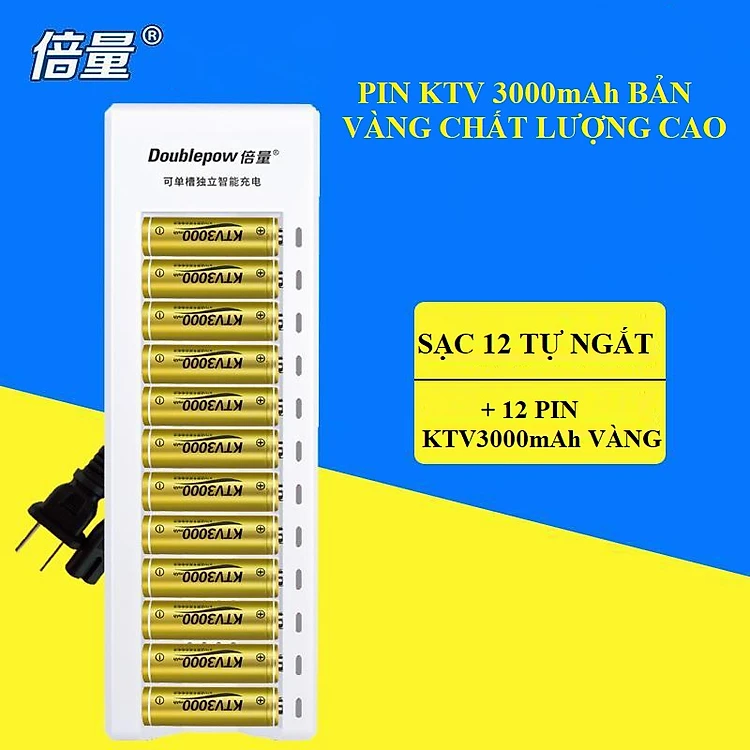 Bộ sạc pin AA/AAA Doublepow DP-K12 Tự ngắt + 12 pin tiểu sạc AA KTV3000mAh Hàng Chính Hãng