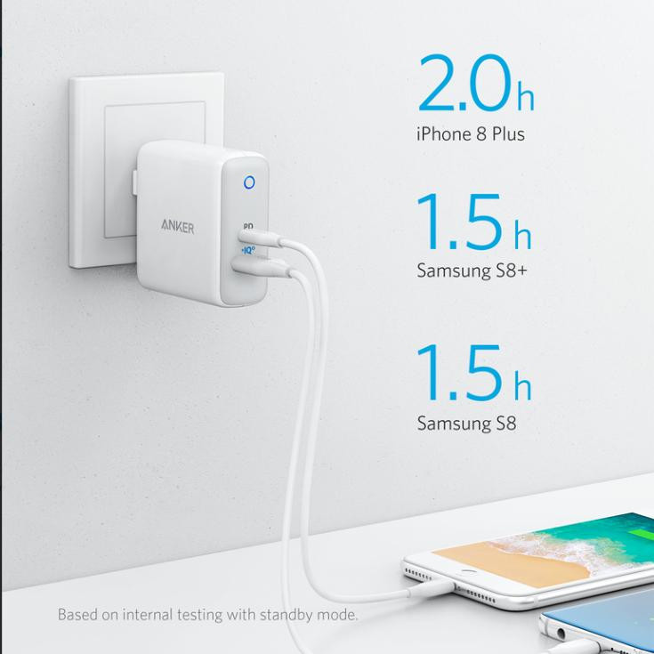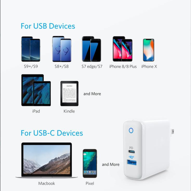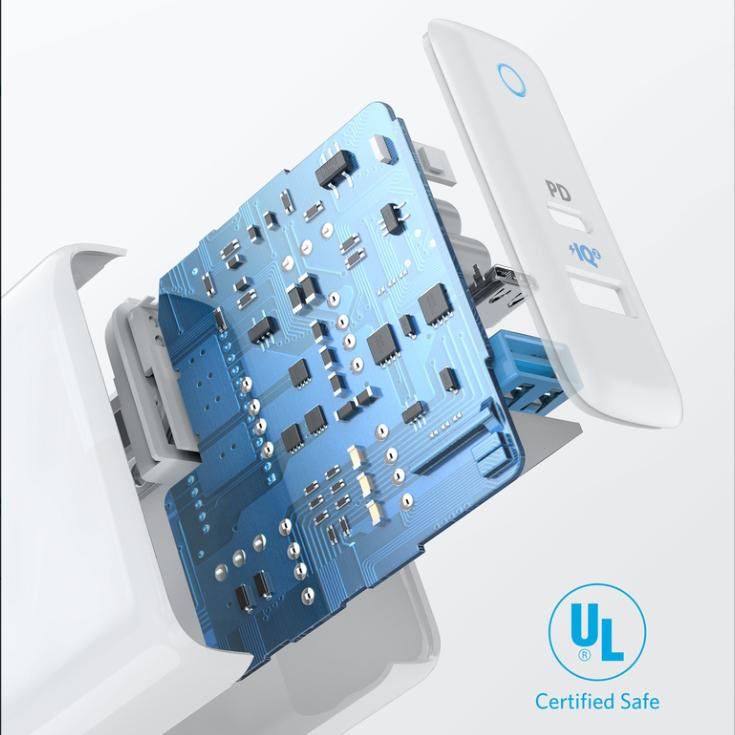 Sạc Anker PowerPort PD+2 - USB-C PD, PowerIQ 2.0 sạc bất kỳ thiết bị USB tiêu chuẩn nào kể cả Quick Charge 2.0/ 3.0 với tốc độ nhanh có thể nhờ PowerIQ 2.0, công nghệ của Anker phát hiện và điều chỉnh công suất đầu ra cho các thiết bị được kết nối của bạn. Thiết bị USB-C nhận được khoản phí 18W cực nhanh từ cổng Power Delivery chuyên dụng.