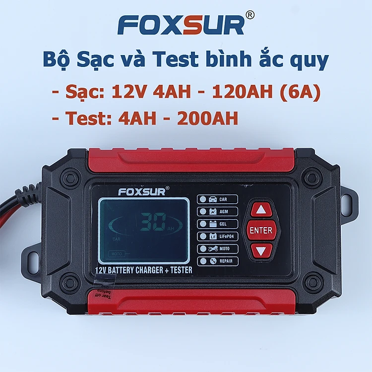 Bộ sạc và test bình ắc quy 12V 2 trong 1 FOXSUR FTC-1206 máy kiểm tra bình ắc quy