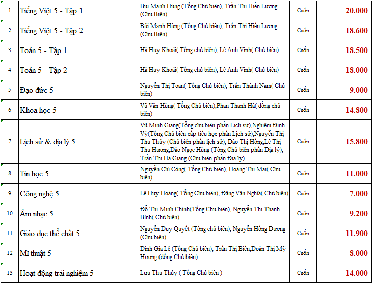 | 1 | Tiếng Việt 5 - Tập 1 | Bủi Mạnh Hùng (Tổng Chủ biên), Trần Thị Hiền Lương (Chủ Biên) | Cuốn | 20.000 |