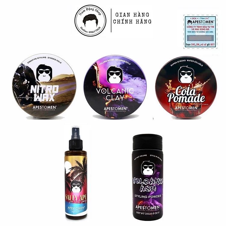 Bộ sản phẩm Apestomen Volcanic Clay, Volcanic Ash, Nitro Wax, Cola Pomade, Salty Ape Sea Salt Spray