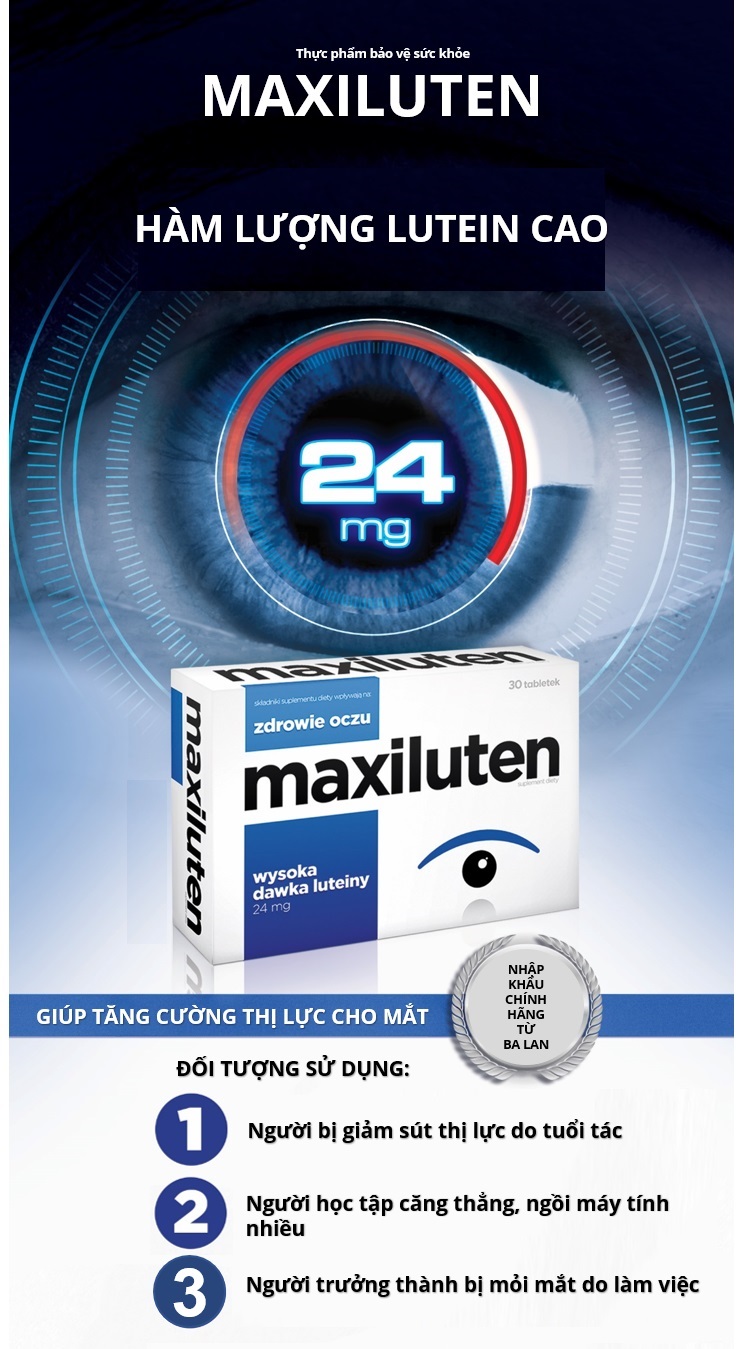 Viên bổ mắt Maxiluten bổ sung hàm lượng cao Lutein (24mg), kết hợp với Zeaxanthin, Beta-carotene và các vitamin, khoáng chất khác giúp tăng cường thị lực cho mắt, bảo vệ mắt sáng khỏe, hỗ trợ làm chậm quá trình thoái hóa điểm vàng của mắt. Maxiluten đặc biệt phù hợp cho người bị giảm sút thị lực do tuổi tác, người học tập căng thẳng, ngồi máy tính nhiều, người trưởng thành bị mỏi mắt do làm việc.