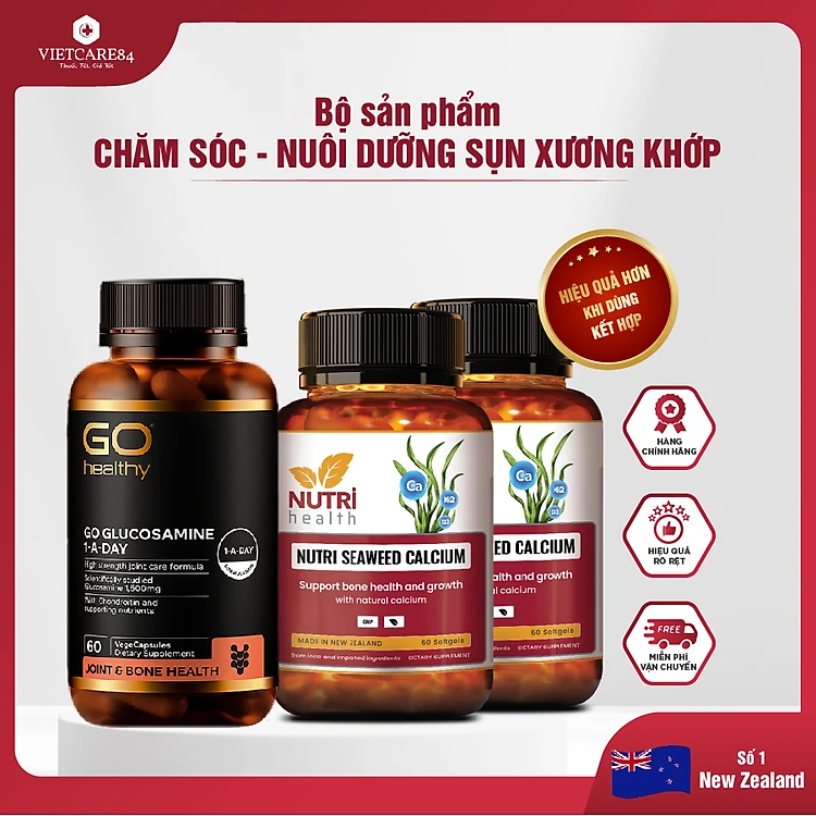 Bộ sản phẩm chăm sóc xương khớp: Viên Xương Khớp GO GLUCOSAMINE 1-A-DAY ; 2 Canxi hữu cơ New Zealand Nutri Seaweed Calcium