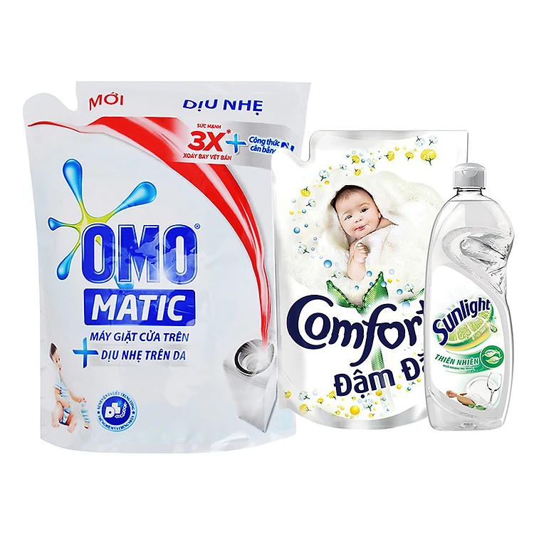 Bộ Sản Phẩm: Nước Giặt Omo Dịu Nhẹ Túi 2.4kg + Nước Xả Vải Comfort Đậm Đặc Cho Da Nhạy Cảm Túi 1.6L + Nước Rửa Chén Sunlight Thiên Nhiên Dạng Chai 750g