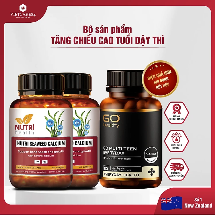Bộ Sản Phẩm Tăng Chiều Cao Tuổi Dậy Thì: 2 Hộp Canxi hữu cơ New Zealand Nutri Seaweed Calcium và GO MULTI TEEN EVERYDAY