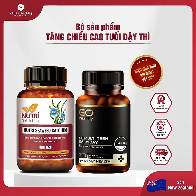 Bộ Sản Phẩm Tăng Chiều Cao: Viên uống Canxi hữu cơ New Zealand Nutri Seaweed Calcium 60 Viên và GO MULTI TEEN EVERYDAY