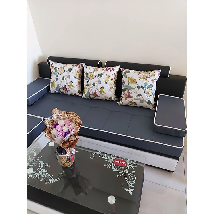 Bộ sofa phòng Khách 2m2 dành cho chung cư Juno Sofa bao gồm đủ gối, đôn và bàn trà kính