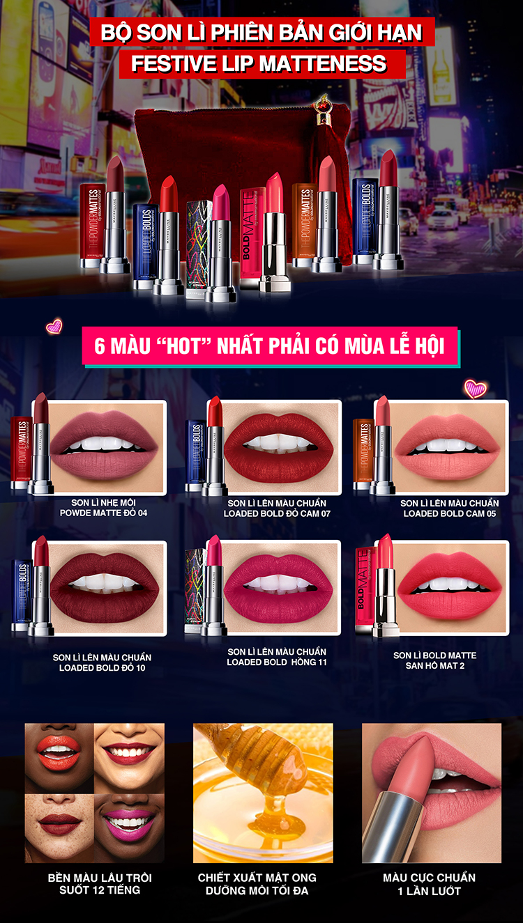 - Bộ Son Lì Phiên Bản Giới Hạn Festive Lip Matteness Maybelline với công nghệ hạt phấn màu cực mịn, chiết xuất dưỡng mật ong tạo hiệu ứng lì siêu mịn, cực nhẹ môi như phủ phấn, giúp lên màu cực chuẩn.