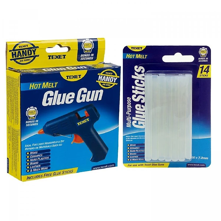 Bộ súng bắn keo TEXET HH-138 và vĩ 14 thanh keo có thể sử dụng để dán các loại vật dụng và chất liệu khác nhau như gỗ, ceramic, nhựa cứng, giấy dày, da... hoặc trang trí trên các đồ thủ công.