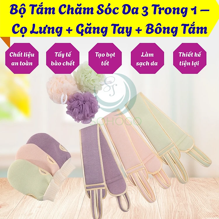 Bộ Tắm Chăm Sóc Da 3 Trong 1 – Cọ Lưng + Găng Tay + Bông Tắm