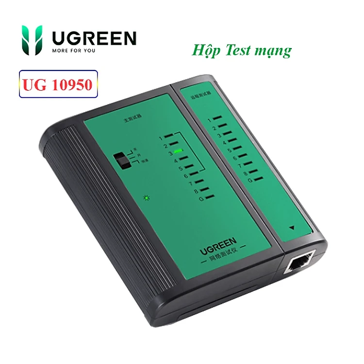 - Bộ Test mạng Ugreen 10950 là thiết bị dùng để thử đầu bấm mạng Lan, điện thoại tương thích với các đầu bấm RJ45, RJ11/12. Dễ dàng sử dụng và nhận biết đầu dây có bắm đúng theo cặp hay không.