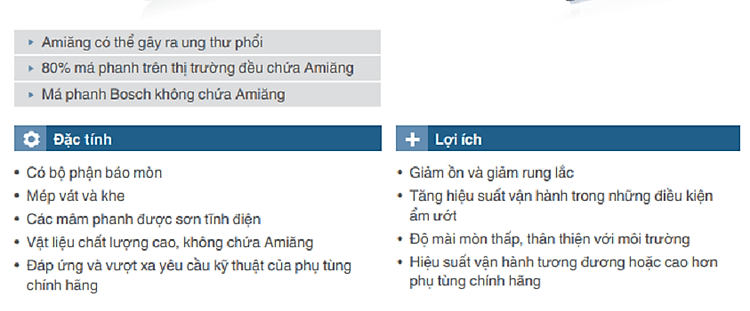 Hệ thống phanh -An toàn và đáng tin cậy Hệ thống phanh Bosch. giúp tăng sự an toàn cho hành khách và sự thoải mái khi lái xe. Hệ thống được thiết kế để đưa xe về trạng thái dừng một cách an toàn, cũng như để giảm thiểu quãng đường phanh trong những tình huống phanh khẩn cấp. Bạn có biết rằng Robert Bosch. đã phát minh ra hệ thống cân bằng điện tử ESP cùng với Daimler-Benz?• Có bộ phận báo mòn• Mép vát và khe• Các mâm phanh được sơn tĩnh điện• Vật liệu chất lượng cao, không chứa Amiăng• Đáp ứng và vượt xa yêu cầu kỹ thuật của phụ tùng chính hãng