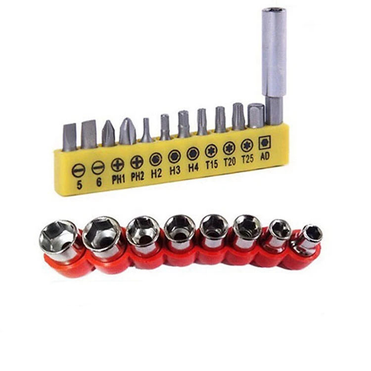 - Sản phẩm gồm có: 2 mũi tô vít 2 cạnh , 2 mũi tô vít 4 cạnh, 3 mũi tô vít hoa thị, 3 mũi đầu lục giác, 1 đầu nối tô vít 60mm, 1 đầu gắn bulong, 8 đầu bulông 5-12mm