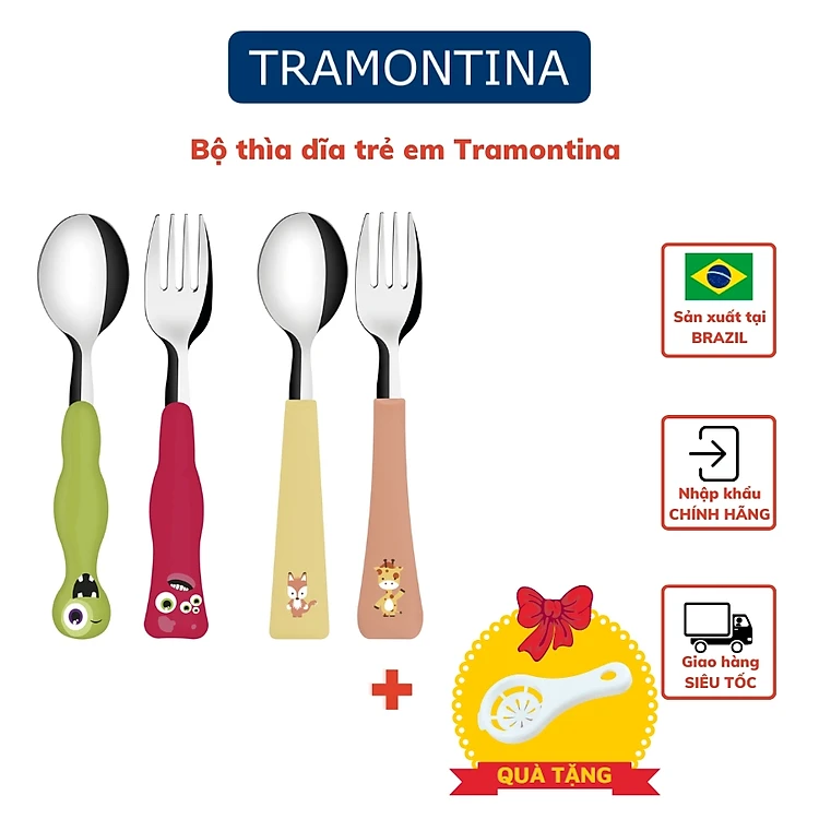 Bộ Thìa Dĩa Trẻ Em 2 Món Tramontina Chất Thép Không Gỉ Cao Cấp An Toàn Cán Nhựa PP Sản Xuất Tại Brazil Tặng Kèm 1 Dụng Cụ Tách Lòng Trứng