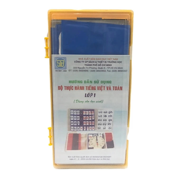 Bộ Thực Hành Tiếng Việt Và Toán Lớp 1 - Chữ cái không có dầu và chữ cái có dấu viết thường , bao gồm các chữ : a, ă, â, b, c, d, đ, e, ê, g, h, i, k, l, m, n, o, ô, ơ, p, q, t, r, s, u, ư, v, x, y. Các dấu : huyền, sắc, nặng, hỏi, ngã - Các nguyên âm, phụ âm và dầu theo font chữ tiêu chuẩn Việt Nam, loại font VnArial, cỡ 72 in đậm theo tiêu chuẩn TCVN-5712 : 1993 . - Chữ và dấu màu xanh đậm ; Chữ in trên nhựa đục màu trắng ; dấu in trên vật liệu nhựa trong suốt . Số lượng các ô chữ ; các nguyên âm là 3, riêng a, ơ là 4. Các phụ âm là 2, riêng b, c, g , l = 3, phụ âm h, m, t = 4 và phụ âm n = 5. Các ô chữ lắp ghép được vào thanh dẫn, dính chặt được vào thanh dẫn, không rơi khi bị va chạm và di chuyển, ô dấu lắp chồng khít lên ô chữ và bám chặt vào ô chữ. Kích thước ô chữ phải trùm lên thanh dẫn về chiều cao. Các ô chữ , dấu và thanh dẫn được xếp kín trong hộp . Đáy hộp in các nguyên âm và phụ âm theo thứ tự chữ cái tiếng Việt. - Bộ hình vuông, hình tròn, hình tam giác. Bộ chữ số, dấu phép tính, dấu so sánh. Bộ thiết bị dạy phép cộng, phép trừ. Mô hình đồng hồ. Thước đo độ dài (20cm). Số in trên nhựa đục màu trắng.