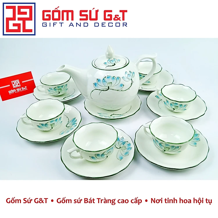Bộ trà chóp lửa men kem vẽ sen xanh Gốm Sứ G&T