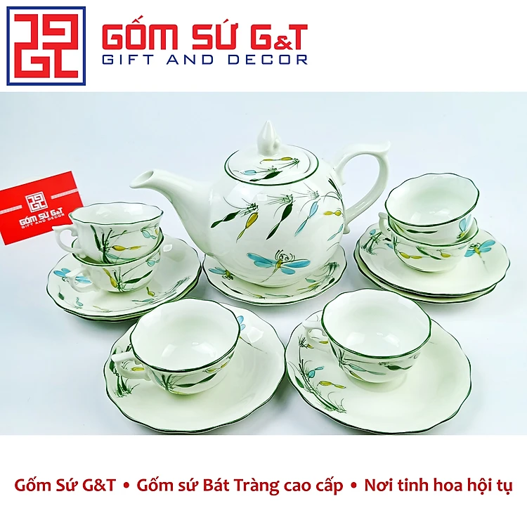 Bộ trà chóp lửa men kem vẽ trúc chuồn Gốm Sứ G&T