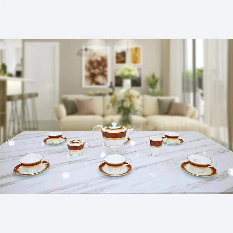 Bộ trà sứ xương cao cấp NORITAKE HEMINGWAY 4733 màu đỏ, mạ vàng - Xuất xứ Nhật Bản - Hàng chính hãng