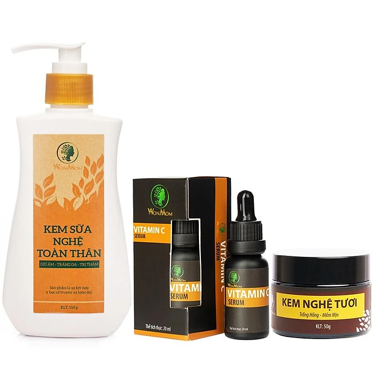 Bộ trắng da mặt và body cơ bản Wonmom ( 1 Serum vitamin C + 1 Kem nghệ tươi + 1 Kem sữa nghệ toàn