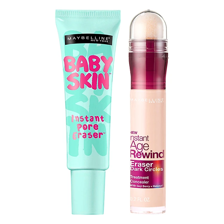 Bộ sản phẩm trang điểm giúp bạn có lớp nền đầy tự tin và không lo khuyết điểm với bút cushion che khuyết điểm đa năng thần thánh Instant Age Rewind và kem lót mịn da nổi tiếng của Maybelline.