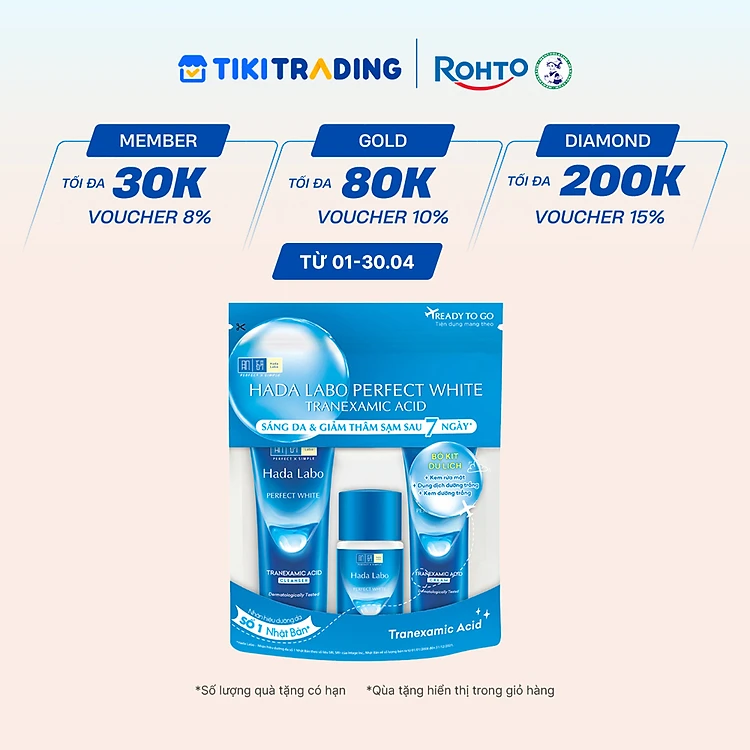Bộ travel size dưỡng trắng Hada Labo Perfect White Tranexamic Acid Travel Set (Kem rửa mặt 15g+Dung dịch dưỡng 20ml+Kem dưỡng 12g)