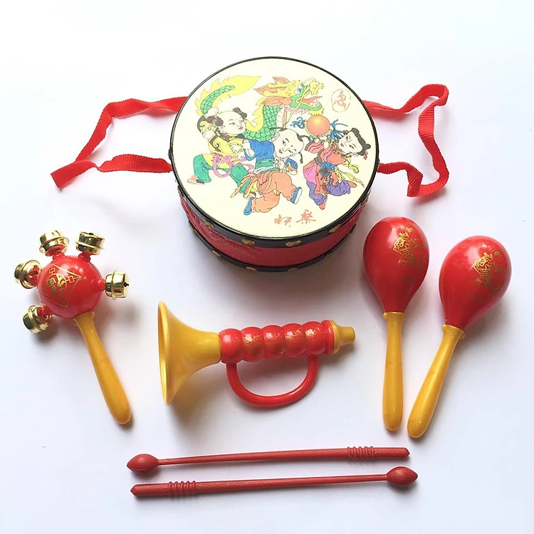 Bộ trống gồm 1 trống đường kính 13cm và 2 dùi , 1 xắc xô, 1 kèn, 2 xúc xắc