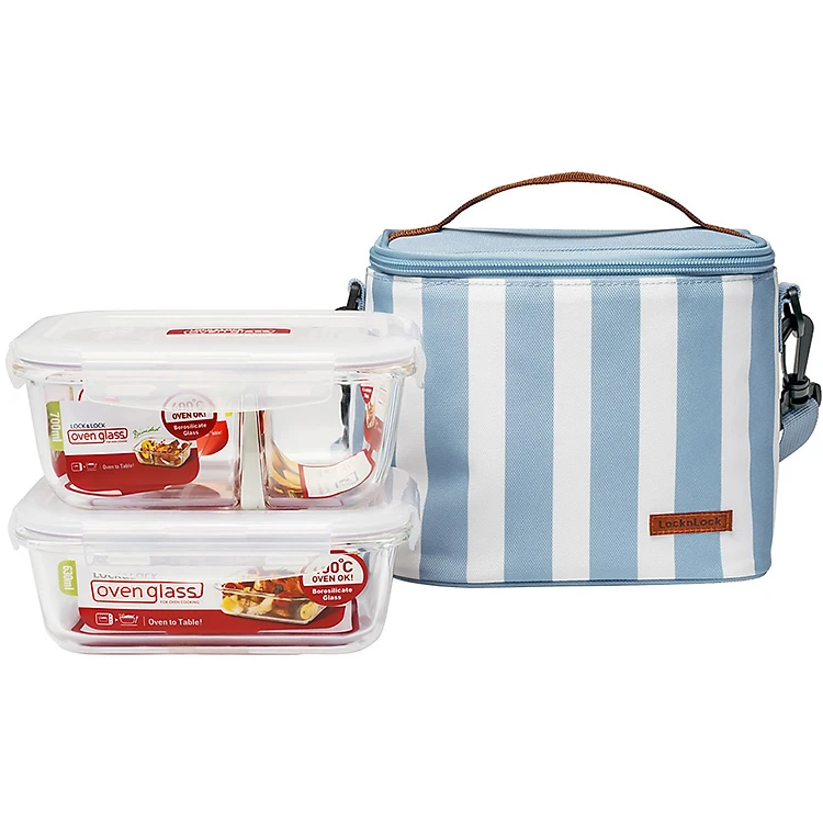 - Bộ túi hộp cơm thủy tinh L&L 3EA LLG428S2 thiết kế đơn giản và trang nhã với họa tiết kẻ sọc.