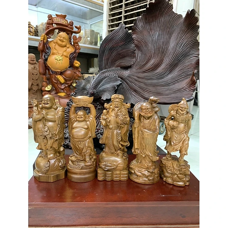 Bộ tượng ngũ vị thần tài bằng gỗ bách xanh thơm nức kt cao 20cm