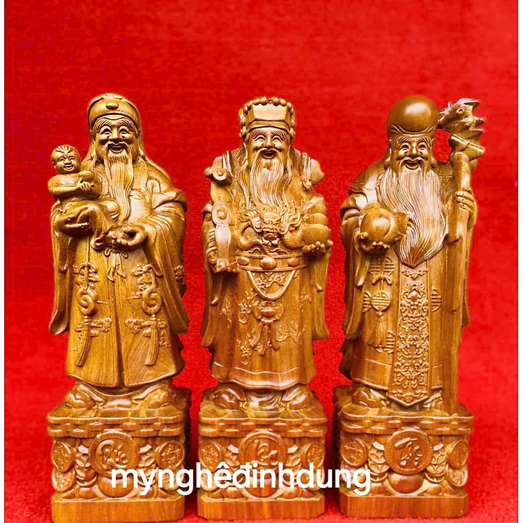 Bộ tượng phật tam đa phúc lộc thọ bằng gỗ bách xanh thơm nức cao 30x11x9cm