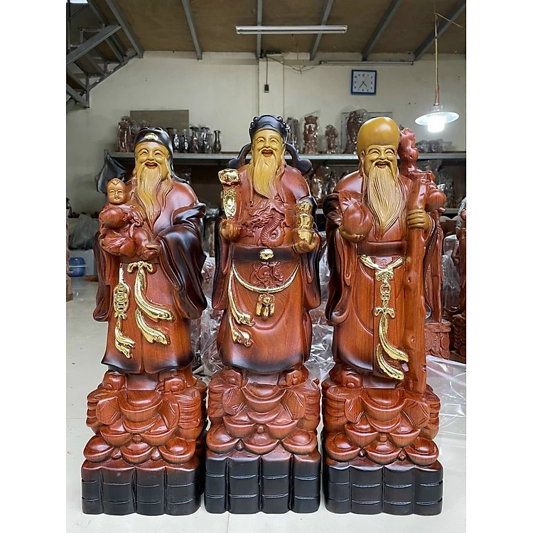 Bộ tượng phật tam đa phúc lộc thọ bằng gỗ hương đá tô làm mầu giả cổ kt cao 50×15×12cm
