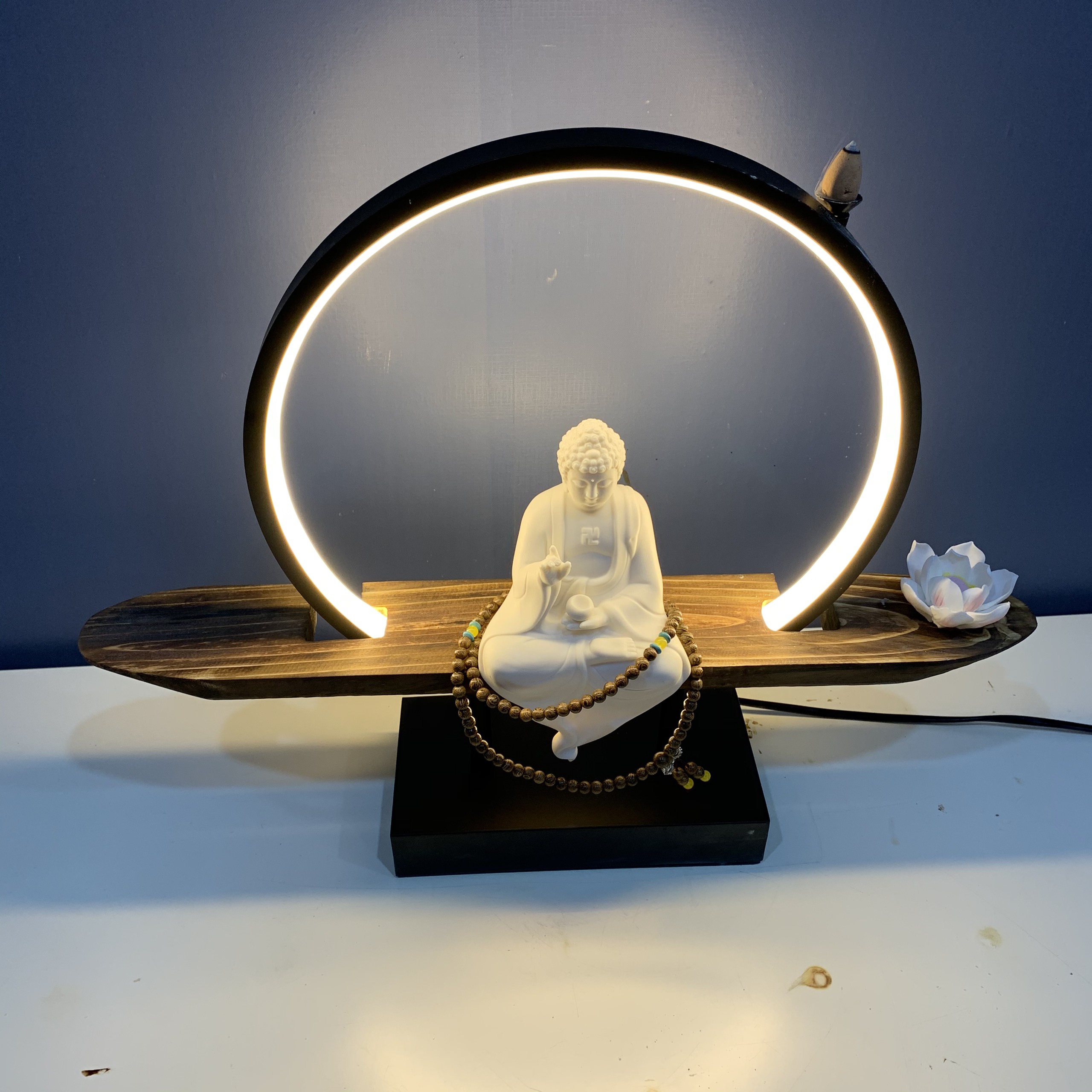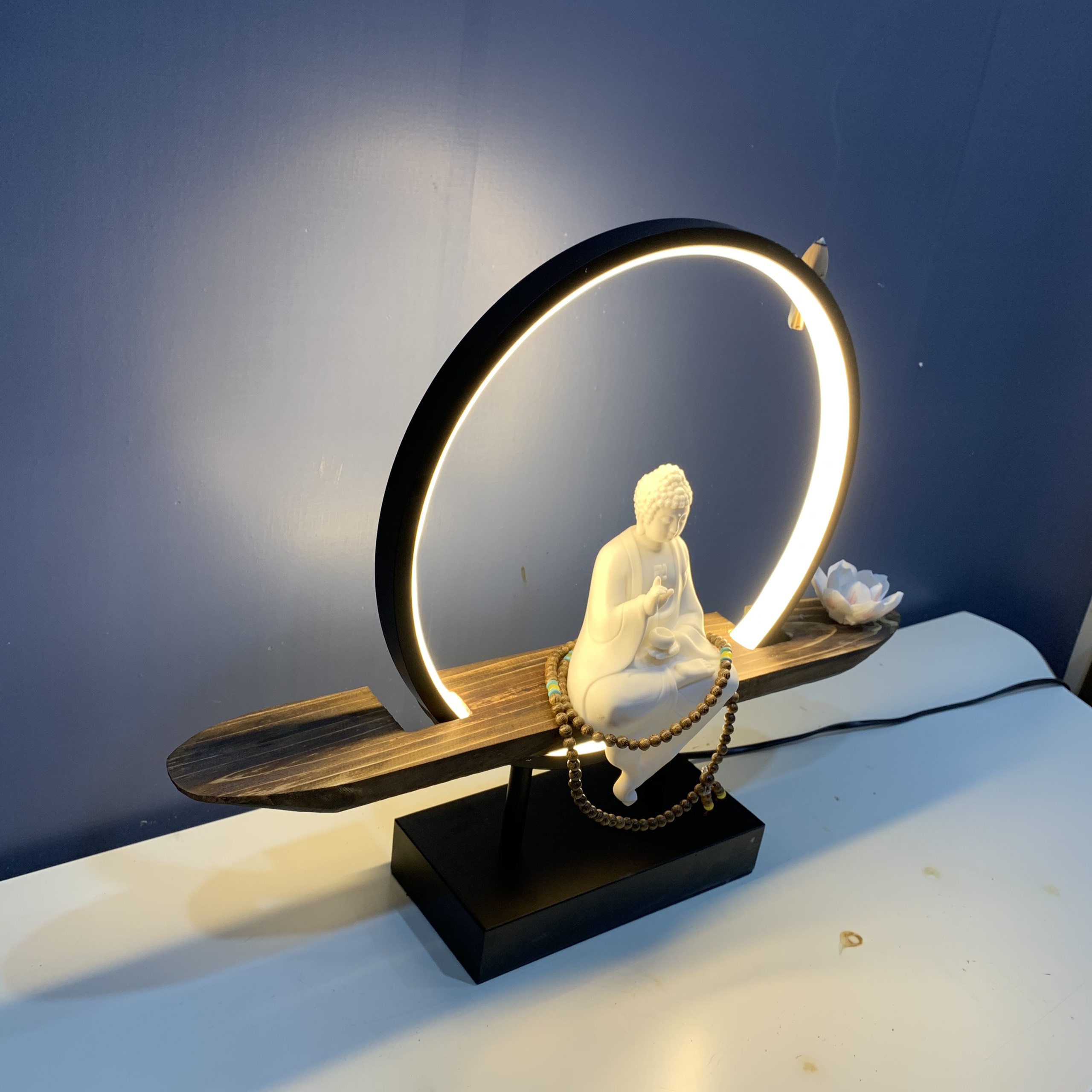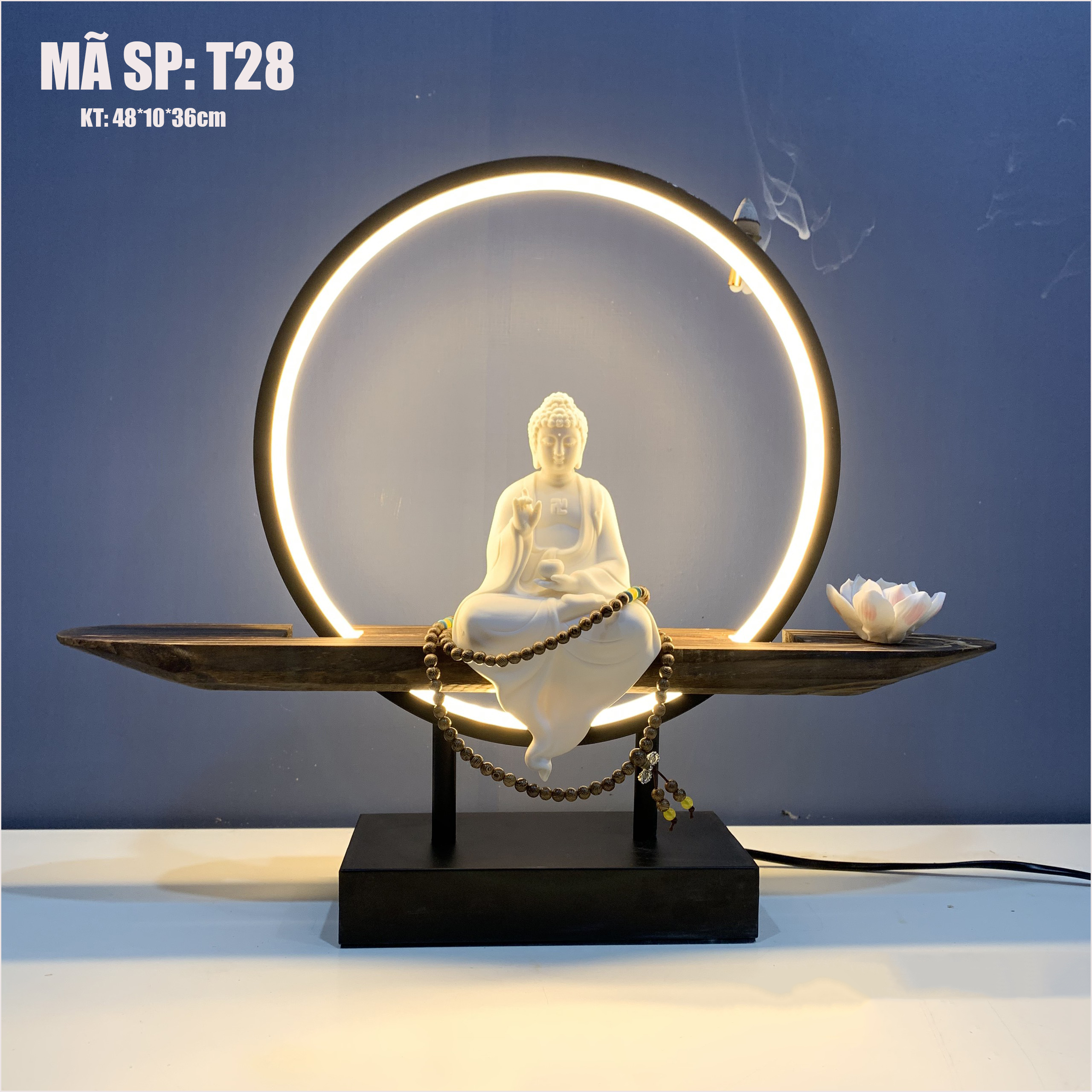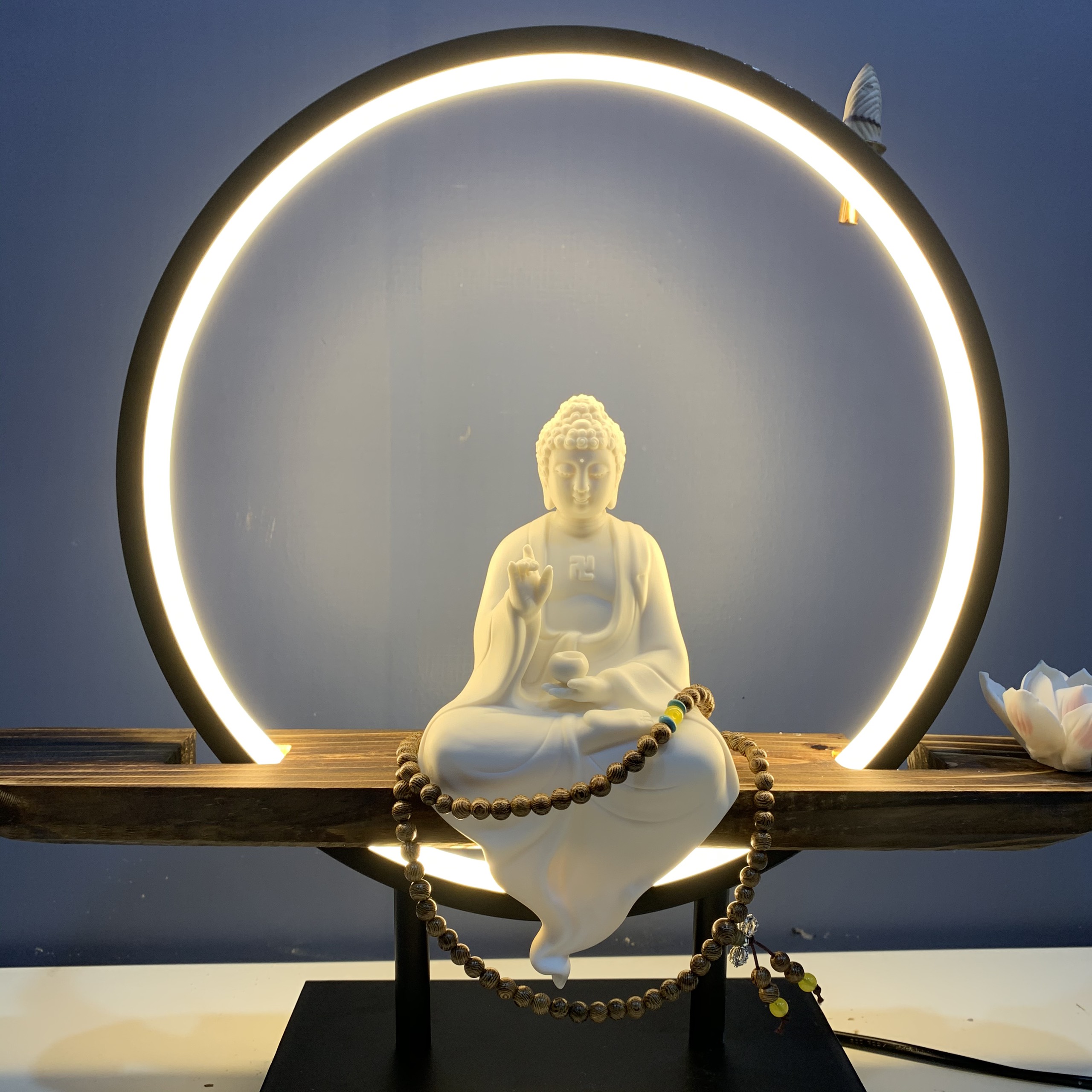 Tượng phật Như Lai được làm từ gốm trắng cao cấp, khung tròn led là hợp kim sơn cách điện, kệ là gỗ.