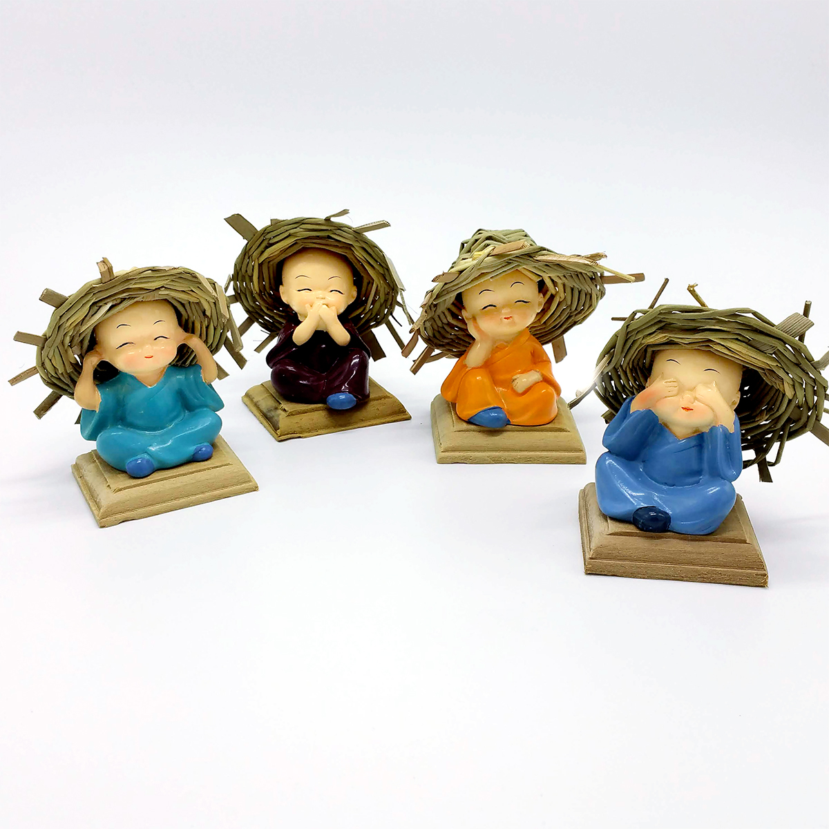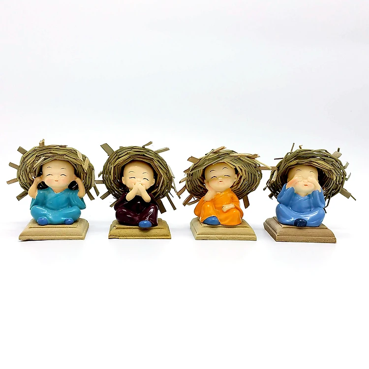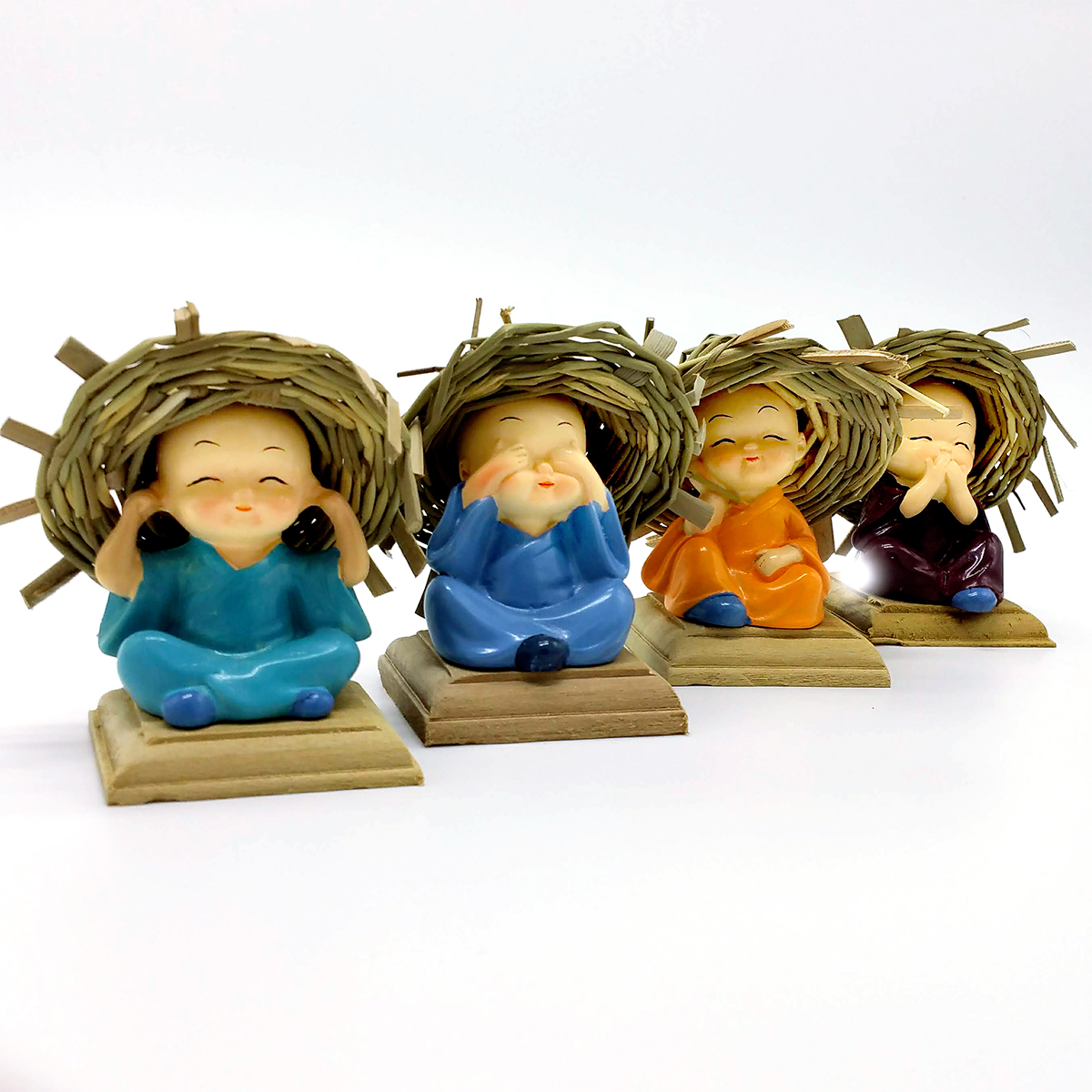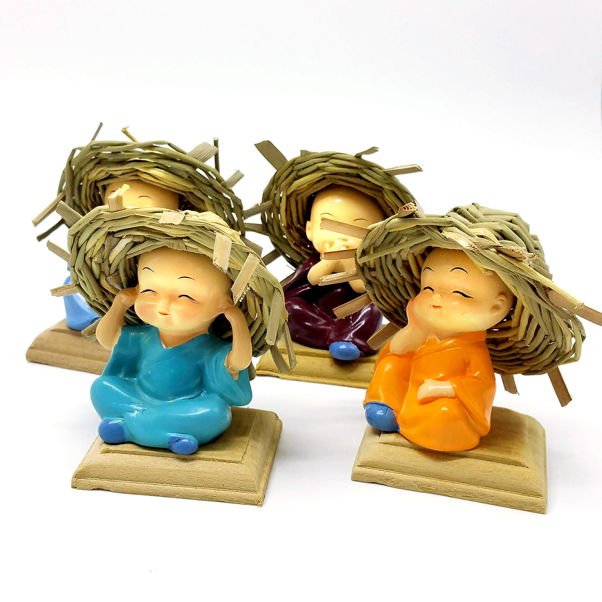 Bộ tượng chú tiểu “không nghe điều sai – không nói điều bậy – không nhìn điều trái – không làm điều quấy”, nhỏ nhắn xinh xắn và rất ý nghĩa để đặt trên bàn làm việc, để xe ô tô, trang trí phòng khách, làm quà tặng,…