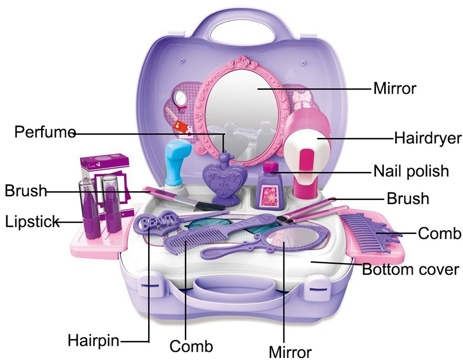 - Bộ đồ chơi bao gồm: gương, lược, cọ trang điểm, kẹp tóc, nước hoa...