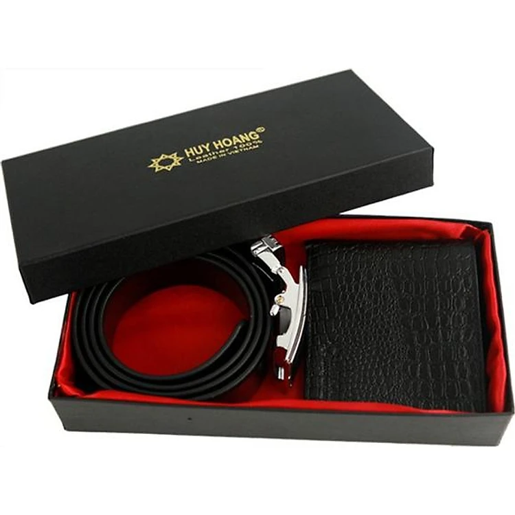 Bộ Ví & Thắt lưng nam Huy Hoàng da bò vân cá sấu màu đen HT2111-HT4114